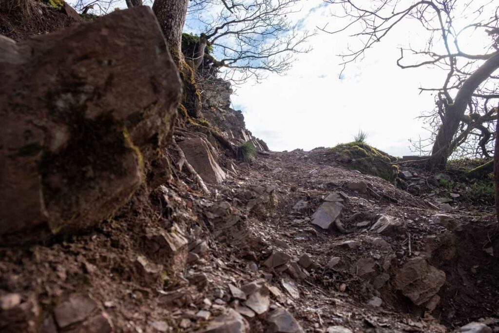 Wer hier von Beginn an spektakuläre Kletterpassagen erwartet, wird enttäuscht. Hinweis, falls ihr es vergessen haben solltet: ihr seid in einem Weinberg in einem Mittelgebirge. Der Weg beginnt recht harmlos auf einem schmalen Single-Trail. Dennoch ist der Weg stellenweise steil und durch Geröll recht rutschig – Trittsicherheit solltet ihr auch hier haben. Der Weg führt dabei noch durch ein wenig Wald, bis es in die wirklichen steilen Hanglagen der Weinstöcke geht, wo die Bäume dann Sträuchern wie Buchsbaum weichen.